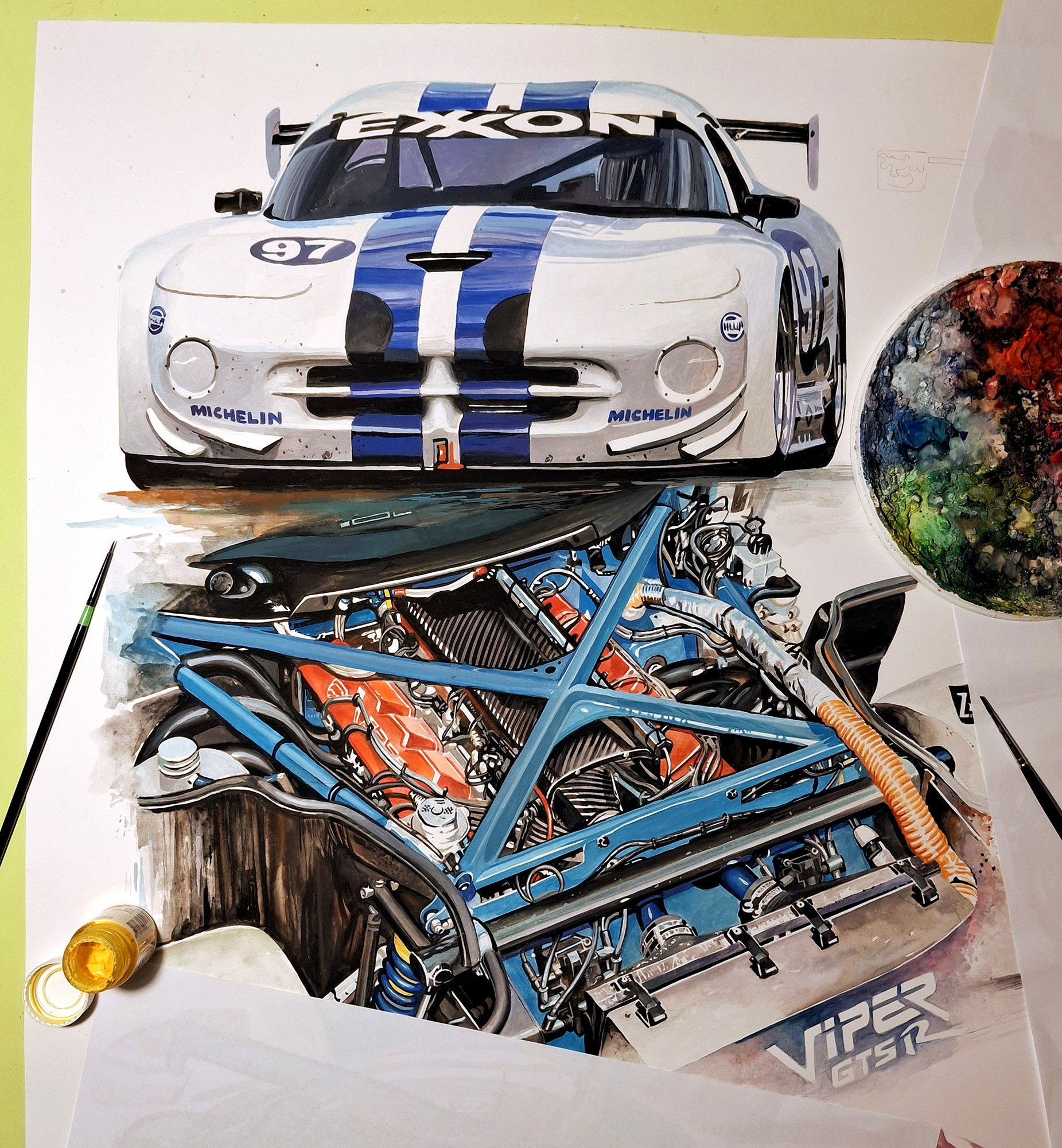 The engine configuration which powered many of GTS-R’s greatest victories, Caldwell Development’s 8.0L V10 shown here in C22 on the way to GTS victory at Le Mans in 1999 with Viper Team ORECA (middle left).